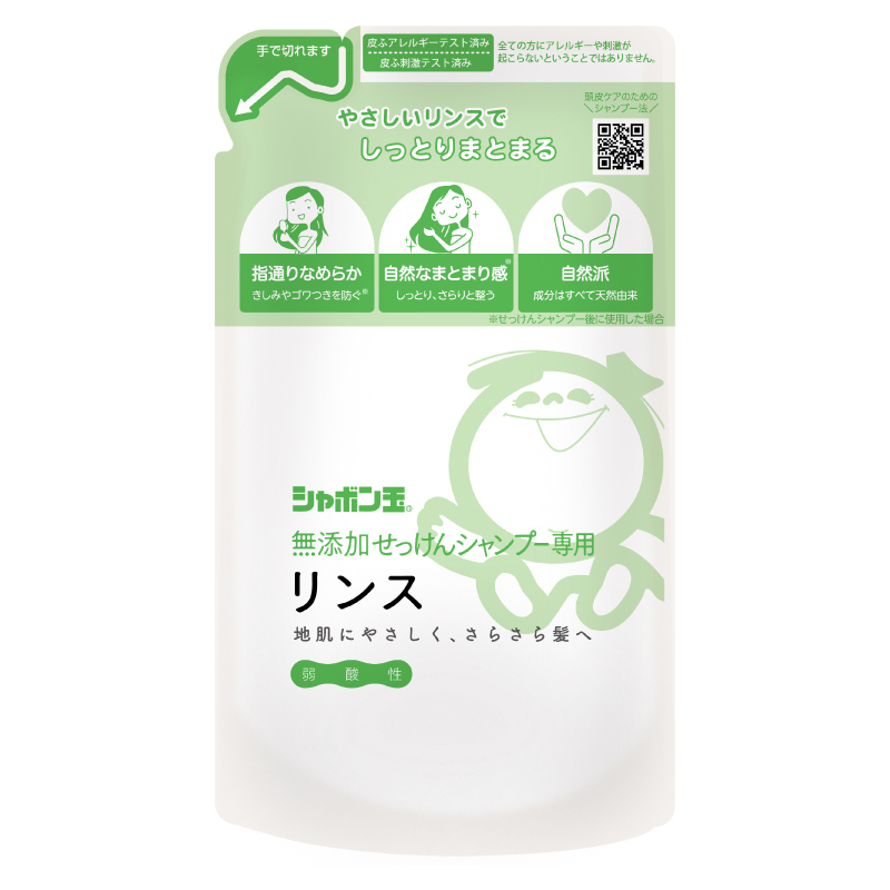 弱酸性の専用リンスは、せっけんシャンプーでアルカリ性に傾いた髪環境を中和し、きしみゴワつきを防ぎ指通りを良くし、髪への負担をおさえます。